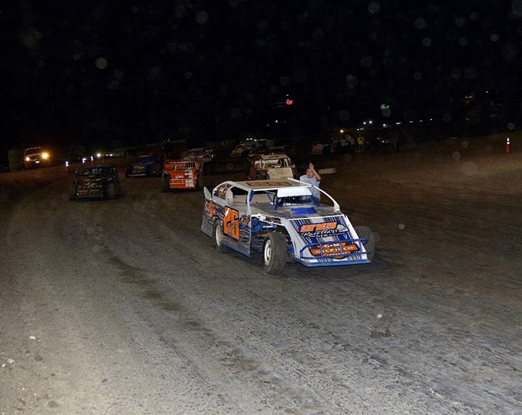 Coming to green for the 20-lap IMCA Modified feature Steve Whiteaker got a good launch off turn 4 leading the way with Ryan Doyon second, Tanner Whitmire and Dustin Butcher side by side for third, and Greg Dinsmore fifth. After a yellow for a spin by Gilbert Amezquita, Whitmire got by Doyon for second. Whitmire was able to give Whiteaker an early look on the bottom.